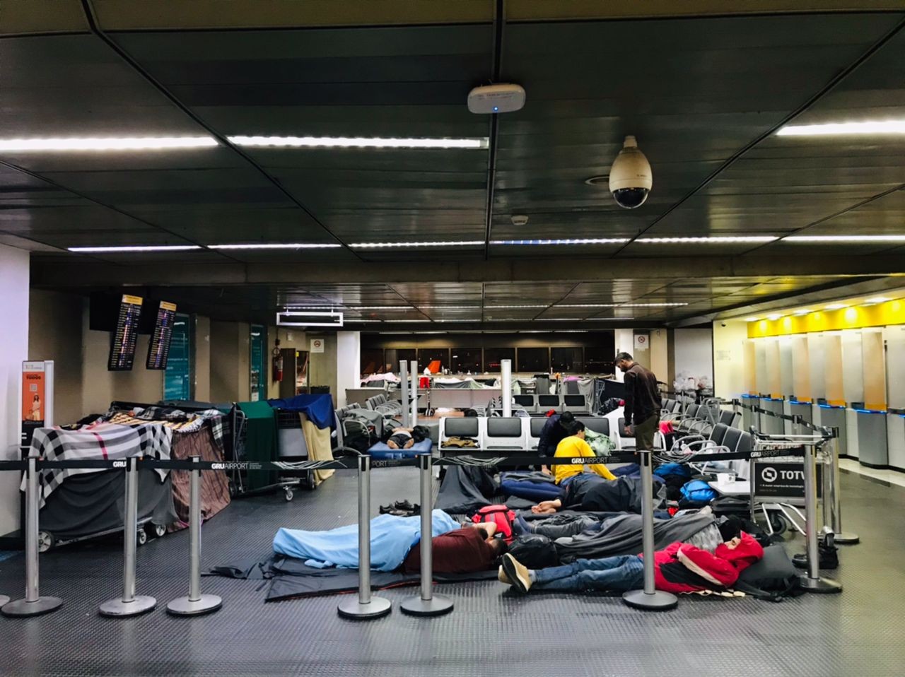 O saguão do terminal virou uma espécie de acampamento para os grupos, que colocam no local bagagens, roupas e colchões doados por voluntários.