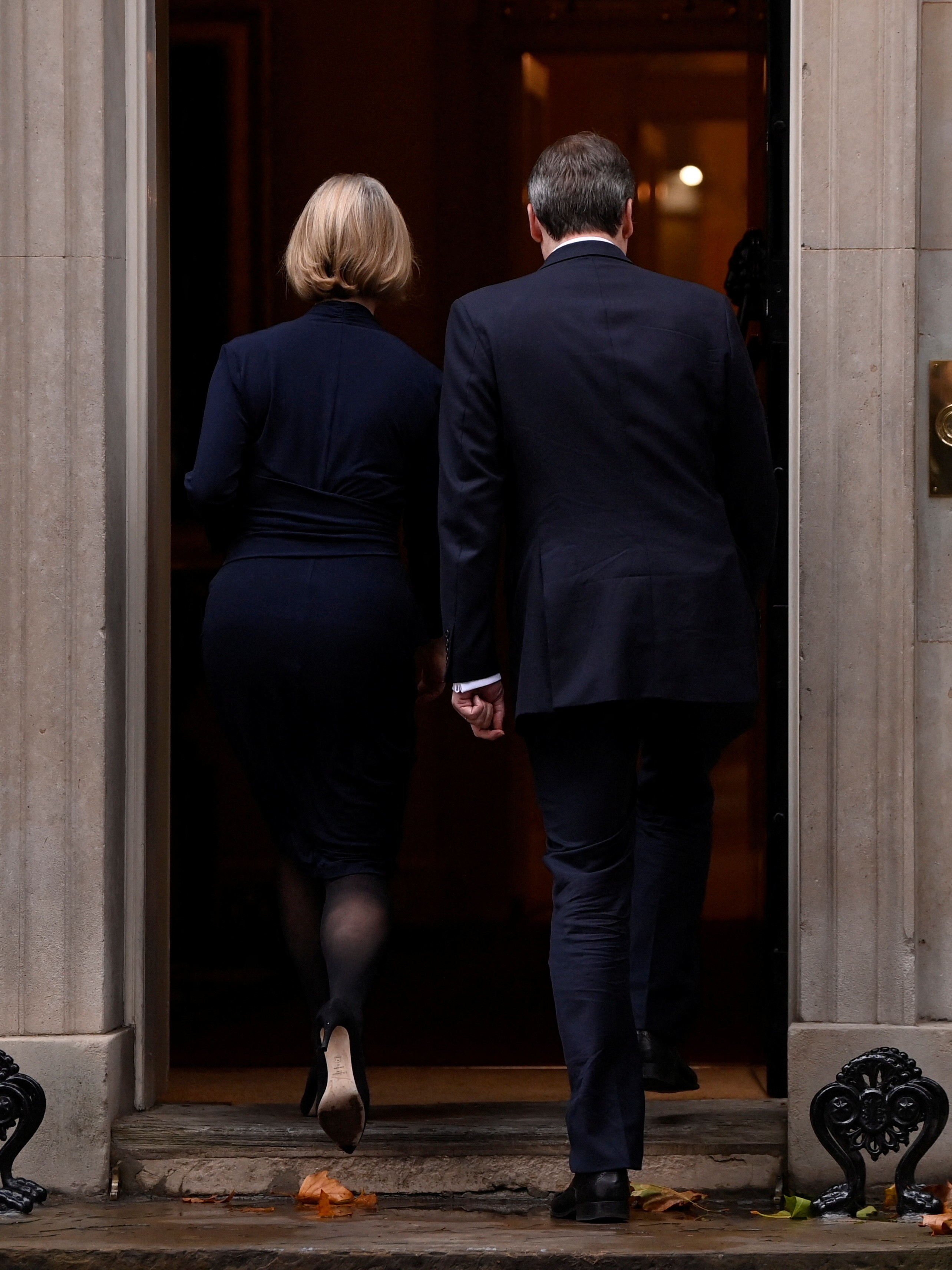 A primeira-ministra britânica, Liz Truss, acompanhada de seu marido após anunciar renúncia do cargo, em 20 de outubro de 2022.
