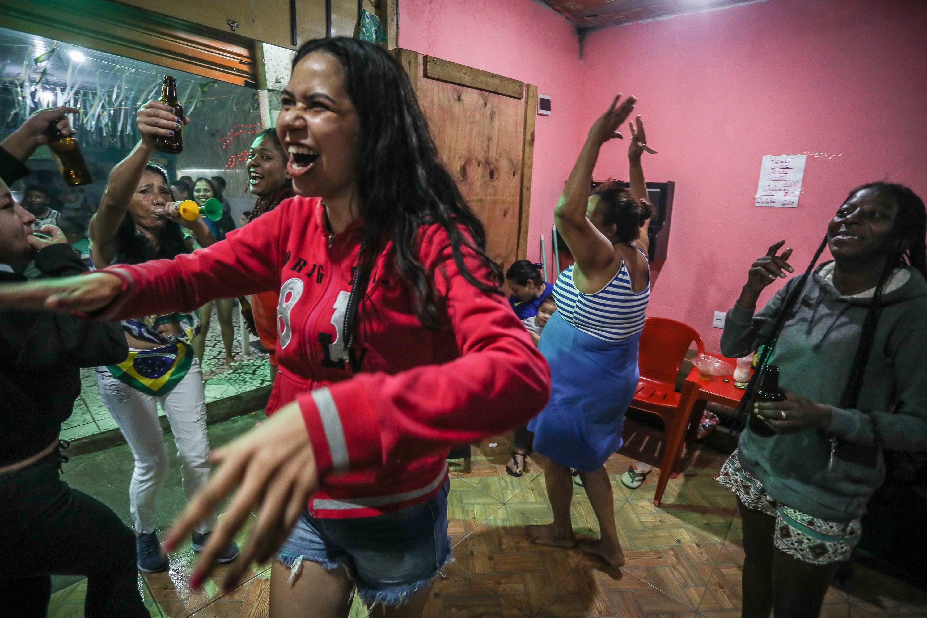 Em questão de poucos minutos, a tragédia se transforma em uma festa que estoura no boteco. Uma mulher, que pouco antes era vista chorando por medo do que poderia ter perdido, desta vez dança e grita com as vizinhas, assopra a buzina de plástico, grita para a câmera.