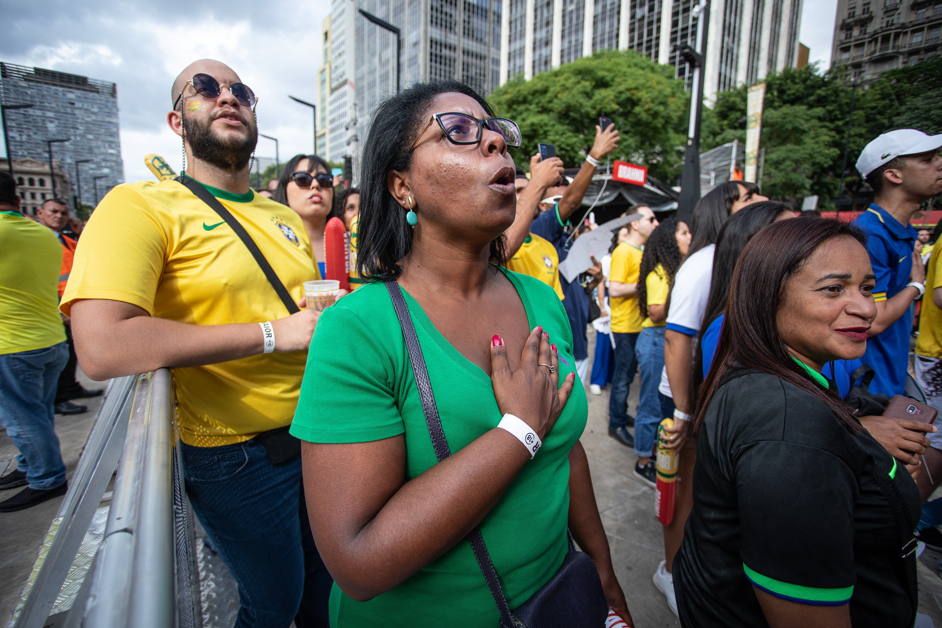 Letra foi escrita em 1909 pelo poeta e jornalista Osório Duque Estrada. Brasil joga contra a Suíça pela fase de grupos da Copa do Catar. Torcedores cantam o hino nacional no Vale do Anhangabaú, em São Paulo, no dia da estreia da seleção na Copa do Catar