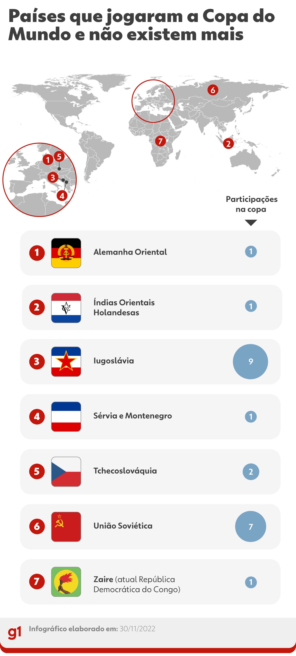 Ao todo, seis países que não existem mais participaram do campeonato mundial. Veja, abaixo, a lista de países e, na sequência, o um pouco da história de cada um deles na Copa e no mundo.
