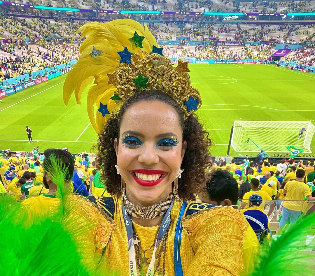 Uma marca da baiana no Catar é a fantasia. Hela Cequt preparou quatro looks para assistir os jogos da Seleção Brasileira. Um deles é o da final do campeonato, que segue sigiloso.