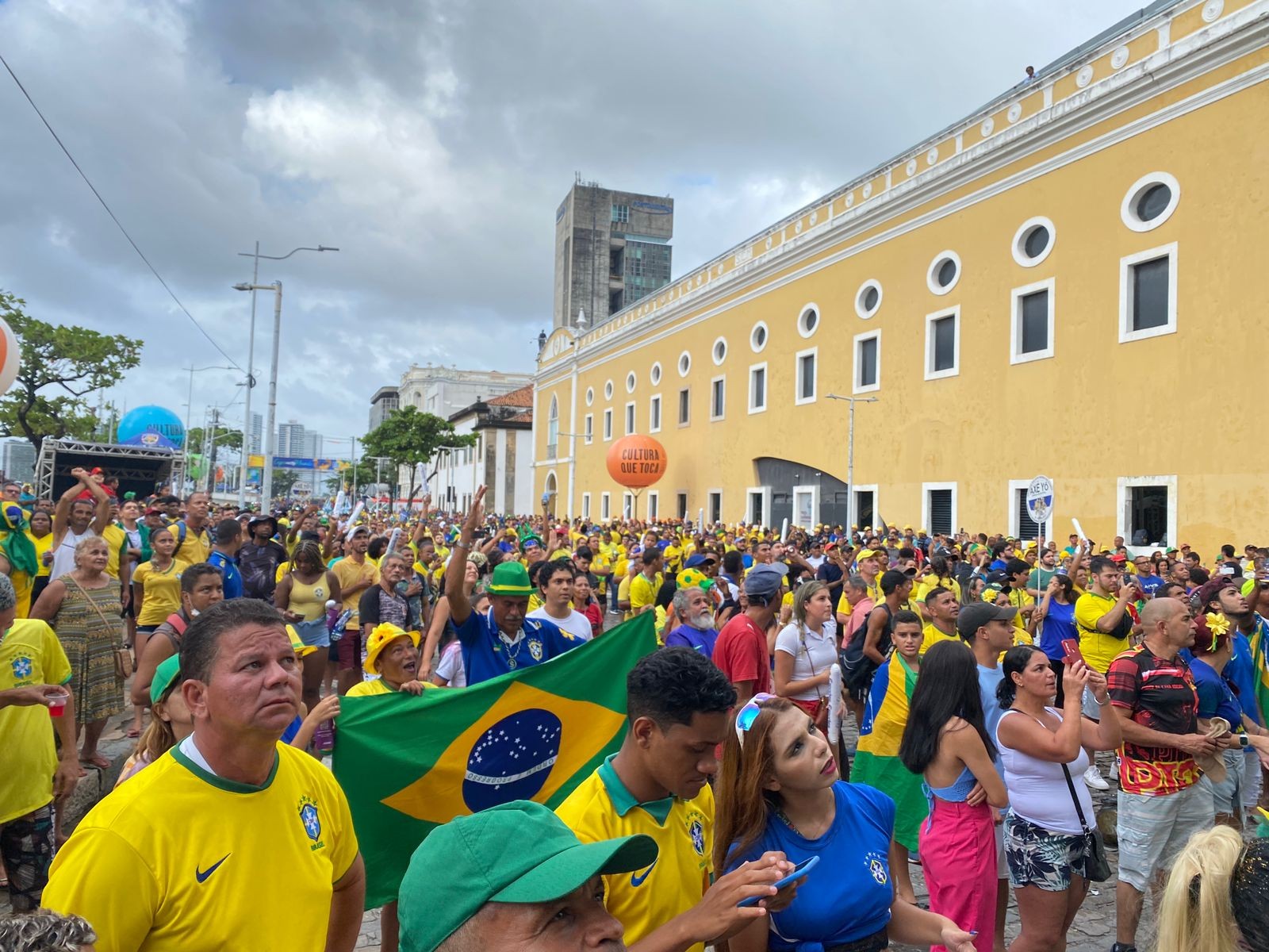 Na capital pernambucana, torcida assiste às partidas da Seleção Brasileira no Mundial da Fifa em telões gigantes no Cais da Alfândega e na Rua do Bom Jesus. Torcedores se reúnem no Cais da Alfândega, no Bairro do Recife, para torcer pela Seleção Brasileira nesta segunda-feira (5)