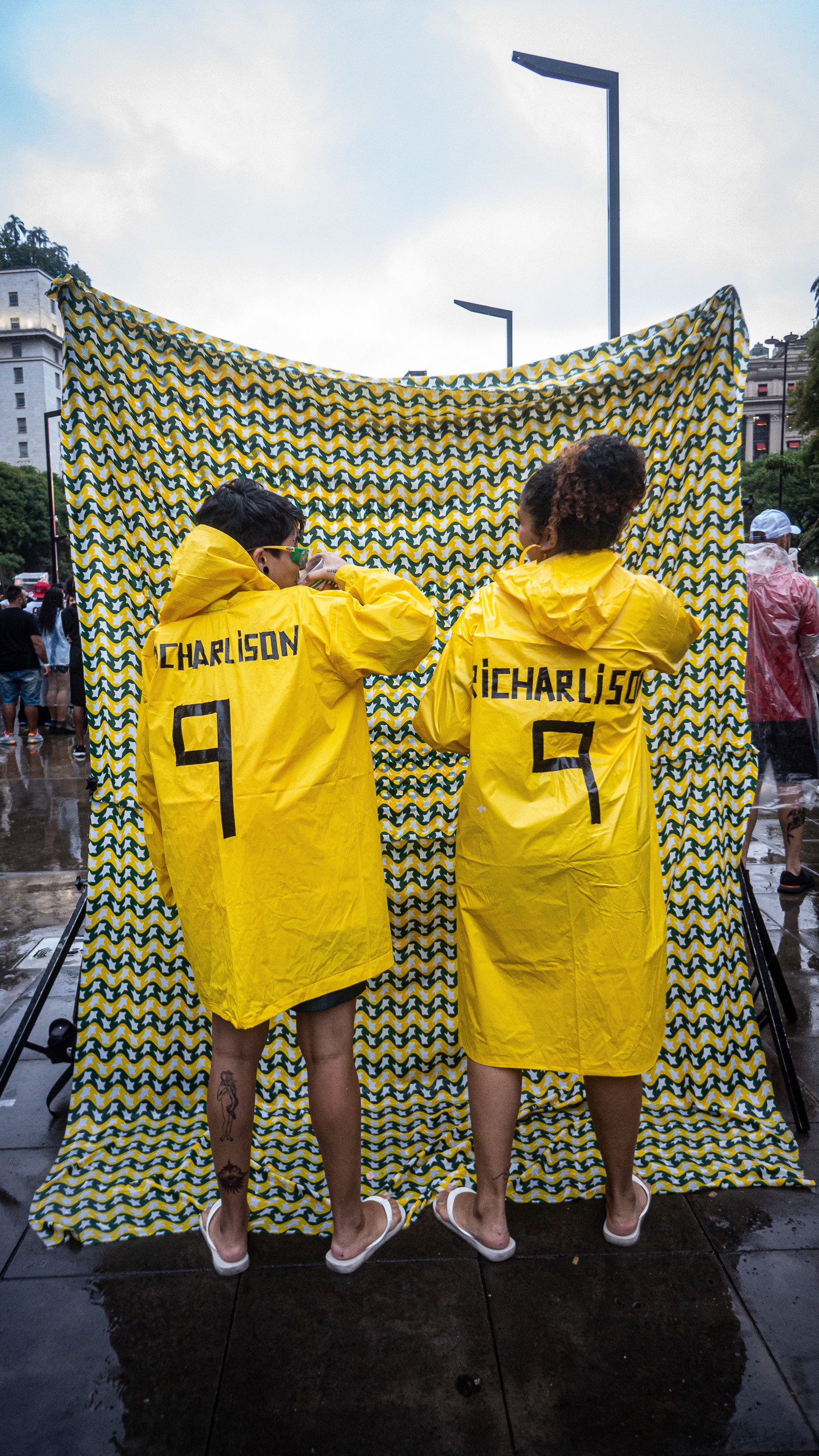 Copa do povo: os torcedores do Brasil no Vale do Anhangabaú. Os sertanejos Matheus e Kauan, que cantaram depois do jogo, também toparam posar para o ensaio especial para o g1