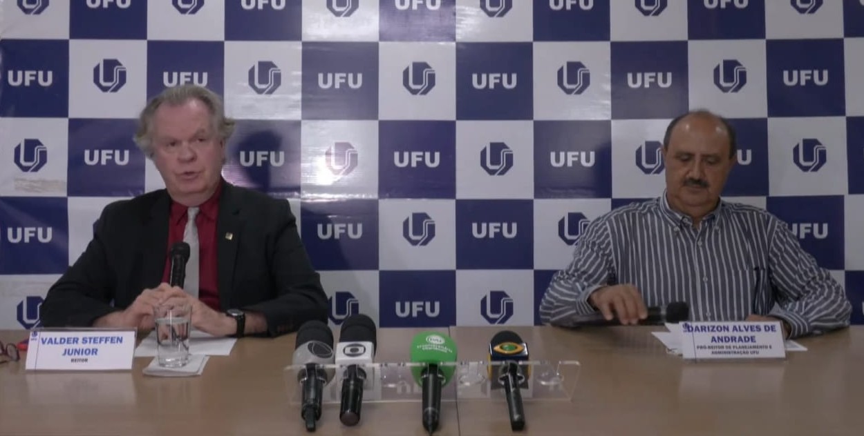 O reitor da Universidade Federal de Uberlândia (UFU), Valder Steffen Júnior, e o pró-reitor de Planejamento e Administração, Darizon Alves de Andrade, cederam entrevista coletiva nesta terça-feira (6) para comentar o bloqueio de R$ 5,8 milhões no limite de empenho sofrido pela instituição. O valor seria destinado ao pagamento de contratos como energia, água e segurança, além dos auxílios estudantis.