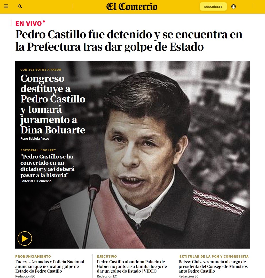 O jornal também deu espaço à explicação dos acontecimentos que antecederam a decisão do presidente peruano desta quarta-feira, informando que o Congresso já previa votar seu impeachment, uma vez que desde sua posse, Castillo esteve envolvido em vários escândalos de corrupção e investigações criminais.