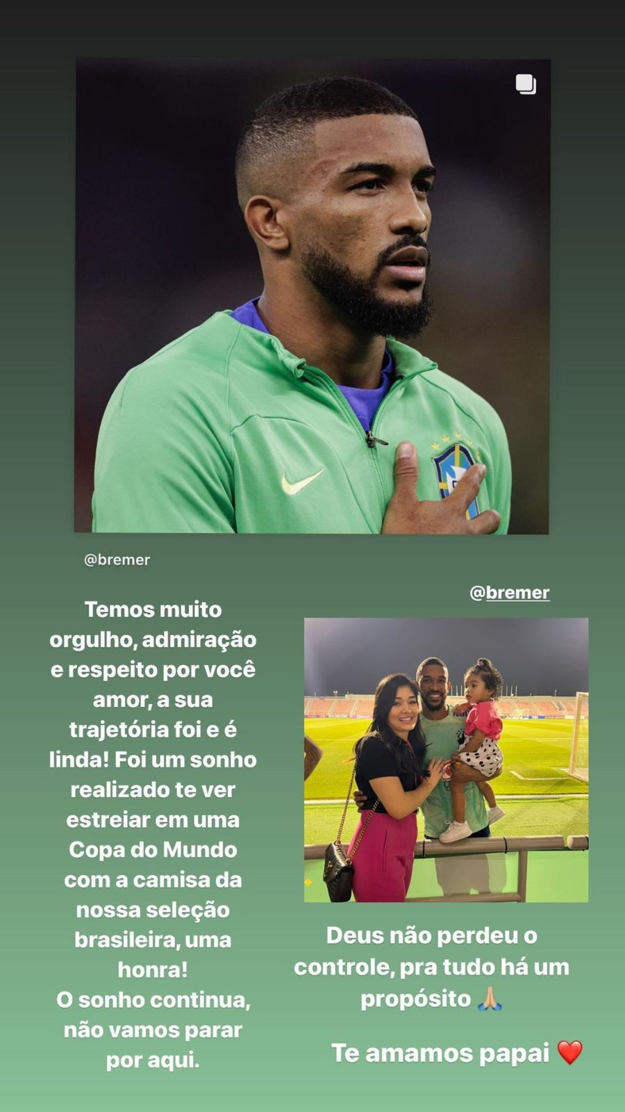 Após eliminação do Brasil na Copa, esposa de Bremer homenageia jogador em rede social: ‘o sonho continua’