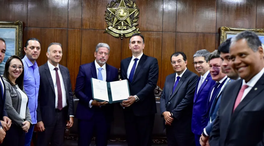 Em movimento simbólico, Lira caminhou do seu gabinete até a presidência do Senado acompanhado por líderes partidários e pelo relator da PEC na Câmara, o deputado Aguinaldo Ribeiro (PP-PB).