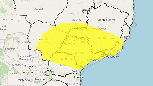 O Instituto Nacional de Meteorologia (Inmet) emitiu alerta amarelo de perigo potencial de tempestade para os os quatro estados do sudeste brasileiro. O aviso também é válido para parte do Mato Grosso do Sul e do Paraná.