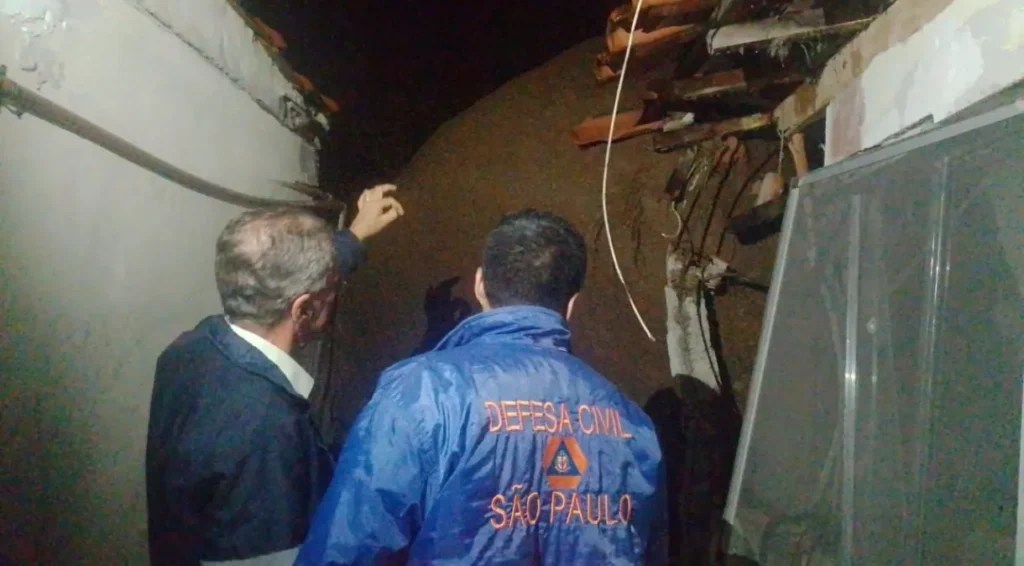 Durante as chuvas, um deslizamento de talude atingiu os fundos de uma residência, no bairro Parque Residencial Itaguassu, e deixou quatro pessoas desabrigadas, conduzidas para o abrigo localizado na região.