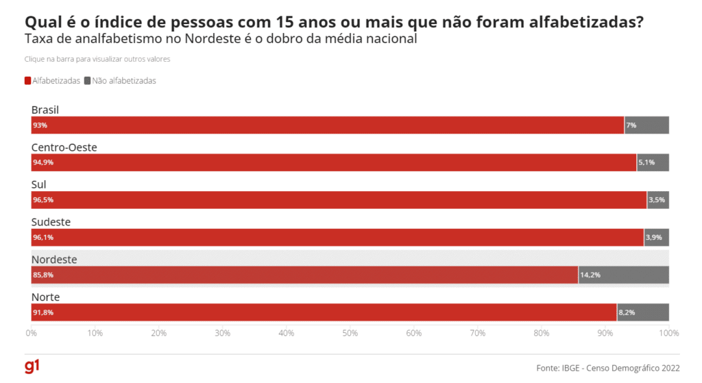 ➡️Em comparação à última edição da pesquisa, de 2010, houve relativa melhora: um salto de 80,9% de alfabetizados no Nordeste para 85,79%.