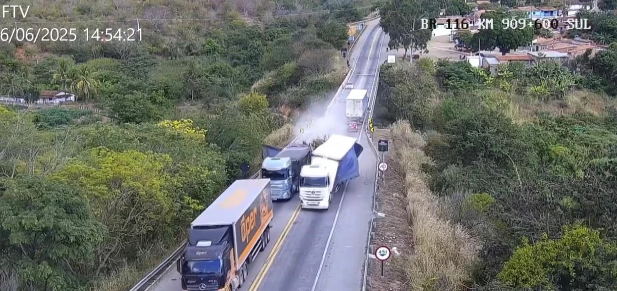 Um acidente envolvendo carretas e um carro interditou totalmente a BR-116, na altura do KM 909, em Cândido Sales, no sudoeste baiano, na tarde da quinta-feira (26). Cinco pessoas ficaram feridas.