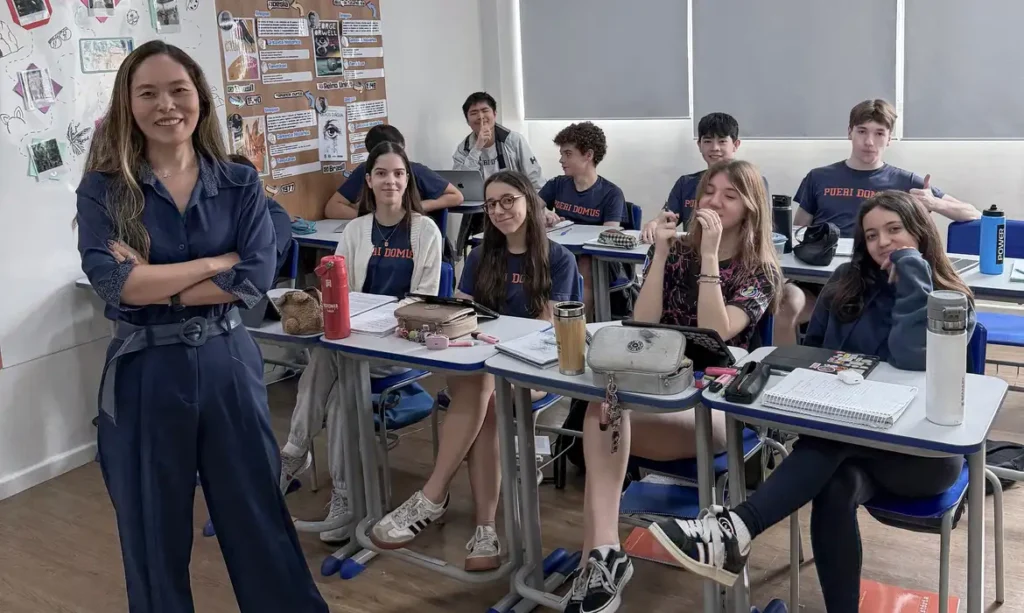 A professora Cintia Etsuko Yamashita, coordenadora pedagógica da Escola Bilíngue Pueri Domus, da Aclimação, em São Paulo, dá dicas aos estudantes – Foto Cintia Etsuko Yamashita/Arquivo pessoal